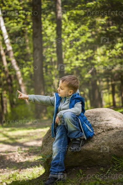 Портрет мальчика в голубой майке в лесу весной. Прогуляйтесь по зеленому парку на свежем воздухе. Волшебный свет от солнечных лучей падает за мальчика