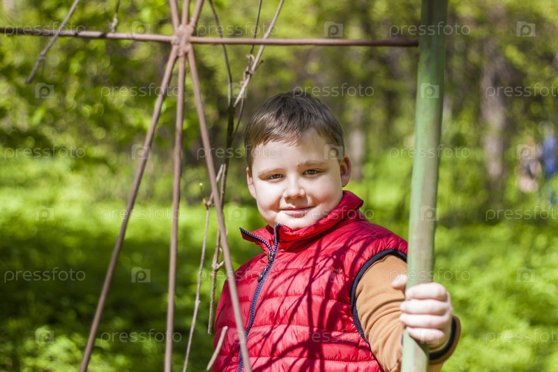 Портрет молодого человека в красной майке в лесу весной. Прогулка по зеленому парку на свежем воздухе. Волшебный свет от солнечных лучей падает за мальчика