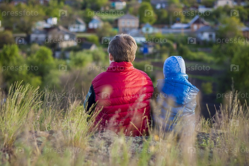 Ребенок сидит на вершине скалы и наблюдает за тем, что происходит внизу. панорамный вид с вершины скалистой горы. Россия, Ростовская область, скалеватая скала, седьмое чудо донского света