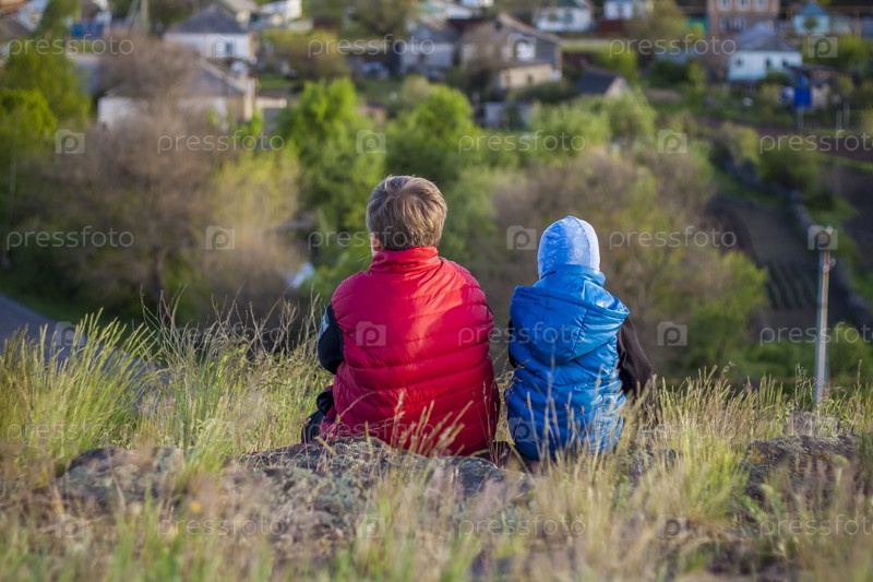 Ребенок сидит на вершине скалы и наблюдает за тем, что происходит внизу. панорамный вид с вершины скалистой горы. Россия, Ростовская область, скалеватая скала, седьмое чудо донского света