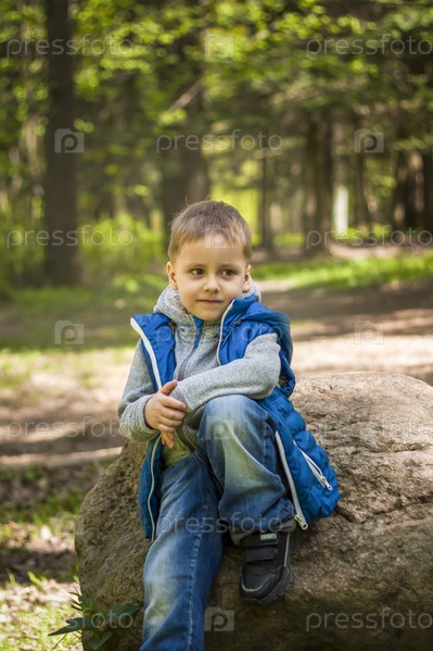 Портрет мальчика в голубой майке в лесу весной. Прогуляйтесь по зеленому парку на свежем воздухе. Волшебный свет от солнечных лучей падает за мальчика