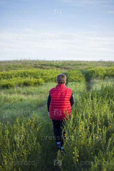 Дети на просторах поля гуляют среди сочной весенней травы в свете заката по узкой протоптанной дорожке