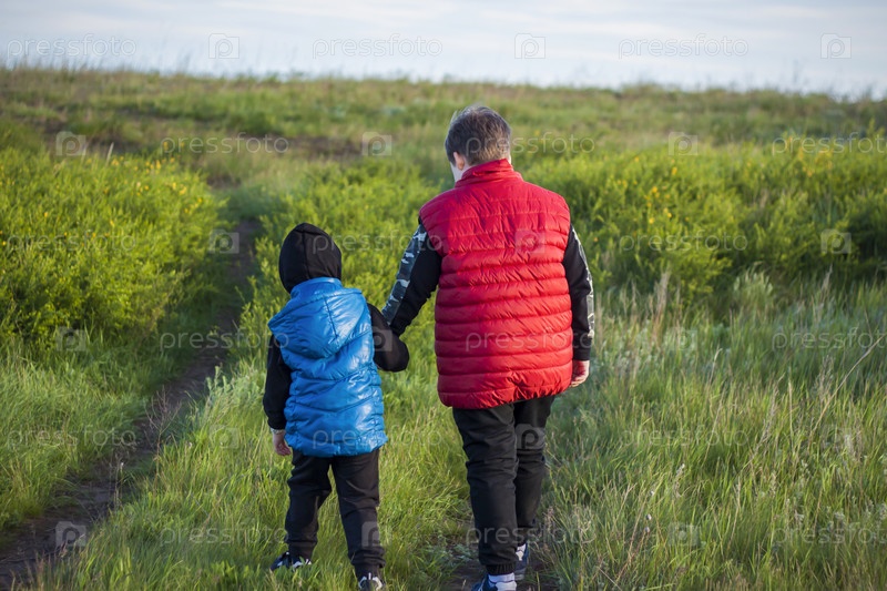 Дети на просторах поля гуляют среди сочной весенней травы в свете заката по узкой протоптанной дорожке