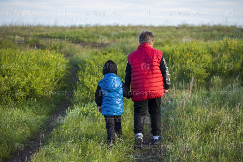 Дети на просторах поля гуляют среди сочной весенней травы в свете заката по узкой протоптанной дорожке