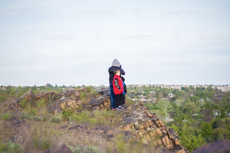 Мужчина и дети стоят на камне и наблюдают за тем, что происходит внизу. панорамный вид сверху. Россия, Ростовская область, скалеватая скала, седьмое чудо донского света