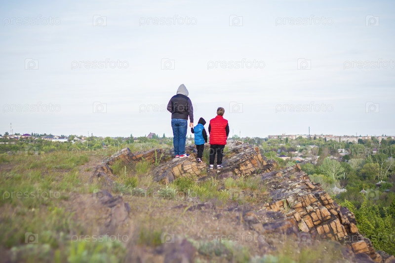 Мужчина и дети стоят на камне и наблюдают за тем, что происходит внизу. панорамный вид сверху. Россия, Ростовская область, скалеватая скала, седьмое чудо донского света