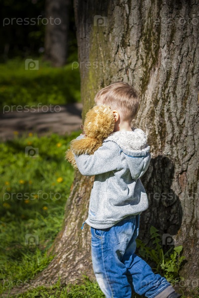 Милый мальчик играет с медвежонком в лесу. Солнечные лучи окутывают пространство. Волшебная история взаимодействий для книги. Место для копирования