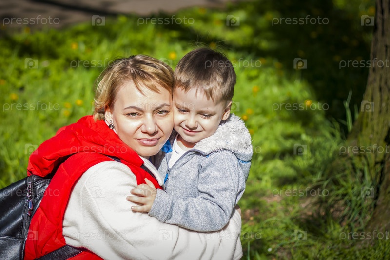 Сын с мамой позируют на солнечной поляне возле дерева в лесу. Солнечные лучи окутывают пространство. История взаимодействия