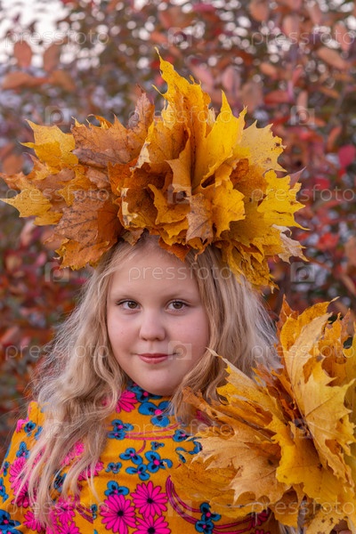 Осень. Девочка держит в руках опавшие осенние желтые красивые листья клена
