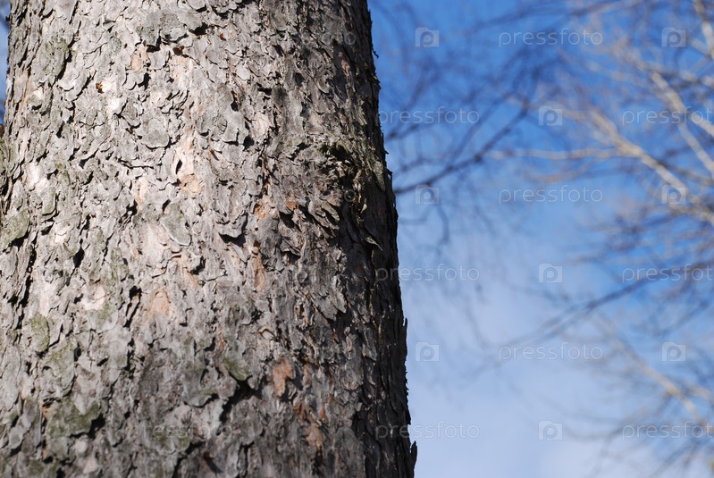 Крупный план ствола сосны среднего размера. Фактурная часть ствола сосны с темно-коричневой корой и мхом на ней освещена солнцем с одной стороны