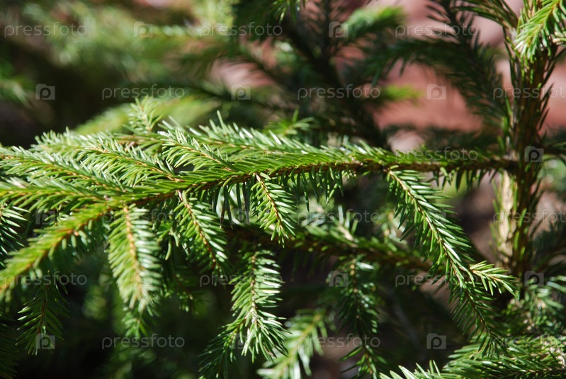 Длинные тонкие ветки рождественской елки под солнцем. Солнечный день крупным планом на коричневых тонких ветвях с короткими зелеными иголками молодой рождественской елки, освещенной солнечными лучами
