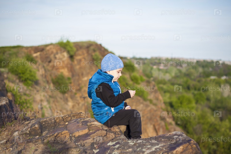 Ребенок сидит на вершине скалы и наблюдает за тем, что происходит внизу. панорамный вид с вершины скалистой горы. Россия, Ростовская область, скалеватая скала, седьмое чудо донского света