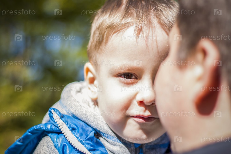 Ребенок находится на руках у отца, спрятавшись за его спину. Взаимодействие. Выражение лица. Прогуляйтесь по зеленому парку на свежем воздухе. Волшебный свет солнечных лучей остался позади
