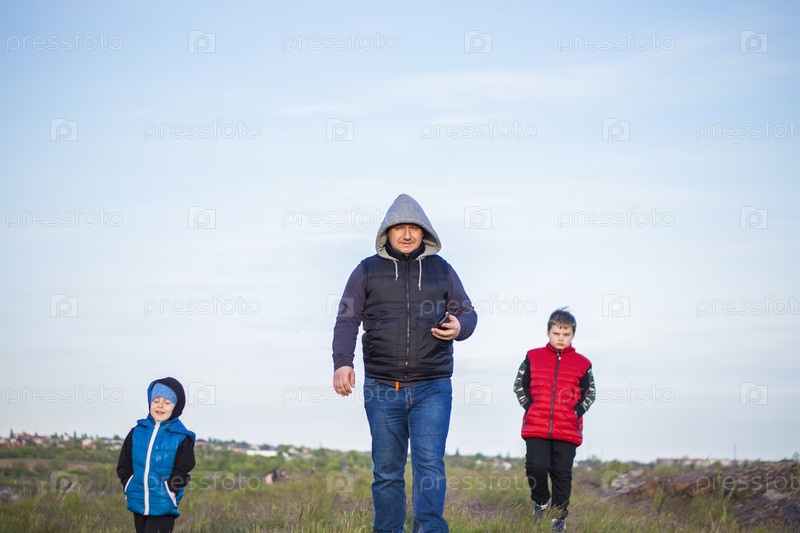 Мужчина и дети стоят на камне и наблюдают за тем, что происходит внизу. панорамный вид сверху. Россия, Ростовская область, скалеватая скала, седьмое чудо донского света