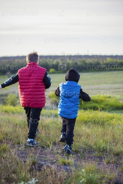 Дети на просторах поля гуляют среди сочной весенней травы в свете заката по узкой протоптанной дорожке