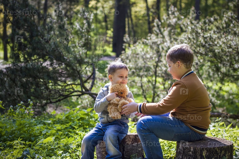 Мальчики в лесу. Солнечные лучи окутывают пространство поляны пеньком. Волшебная история взаимодействий для книги. Место для копирования