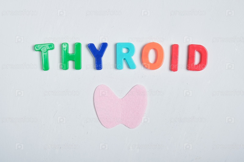 Вырезанная из войлока щитовидная железа и надпись из пластиковых букв щитовидной железы на сером фоне, концепция месяца осведомленности о щитовидной железе