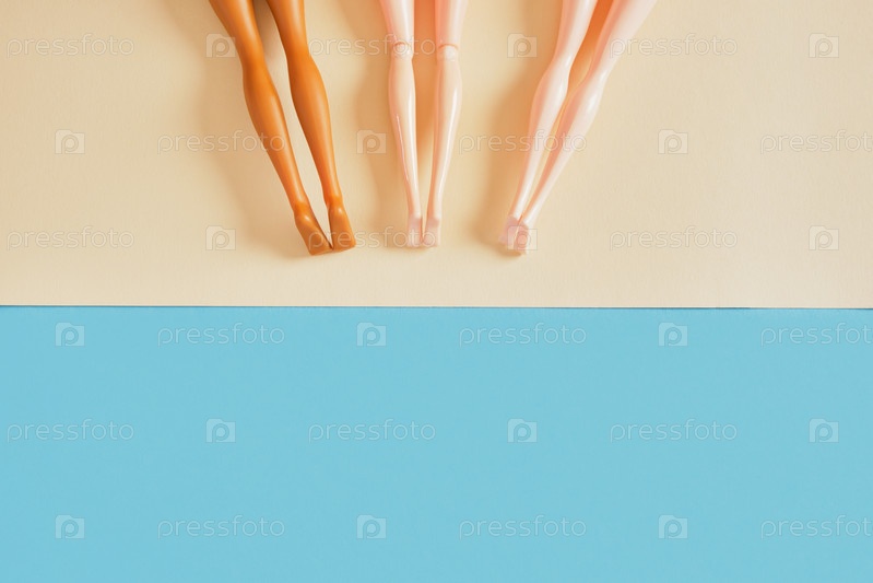 Креативная минимальная концепция пляжа. Летний отдых с кукольными ножками на бумажном песке, плоский бассейн, пляж
