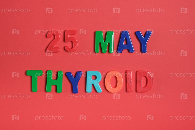 Надпись из пластиковых букв день щитовидной железы 25 мая на красном фоне, концепция месяца осведомленности о щитовидной железе
