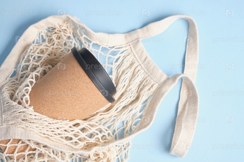 Сетчатая эко-сумка и термо-кофейная чашка на синем фоне. Экологичный образ жизни без отходов. Концепция без пластика