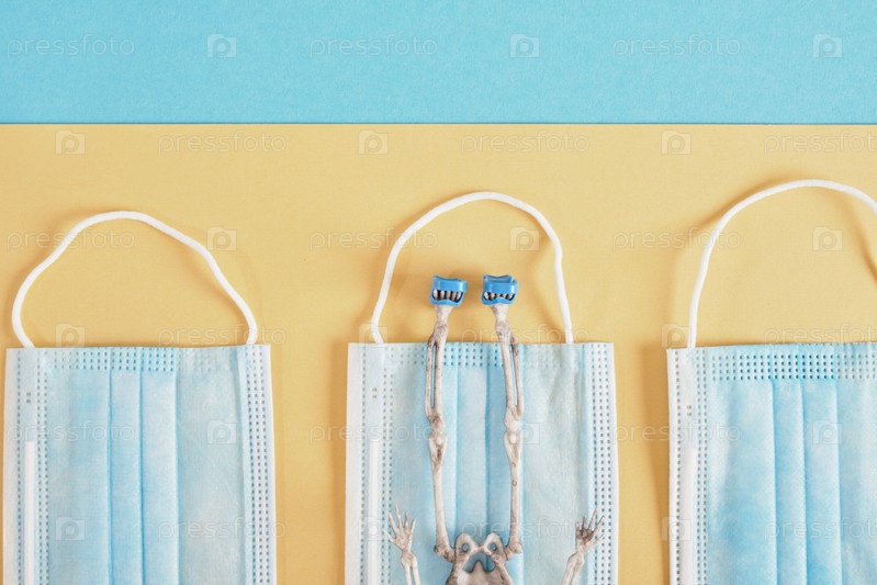 Пластиковый скелет и защитные маски для лица на бежевом фоне, концепция летних каникул на пляже, минимальная концепция туризма во время эпидемии коронавируса, вид сверху