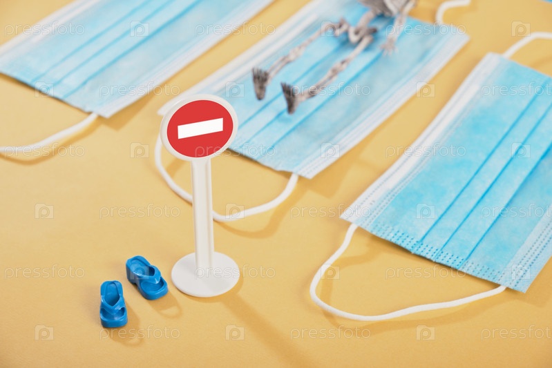 Знак остановки, скелет и маски для лица, концепция летних каникул, туризм во время эпидемии коронавируса