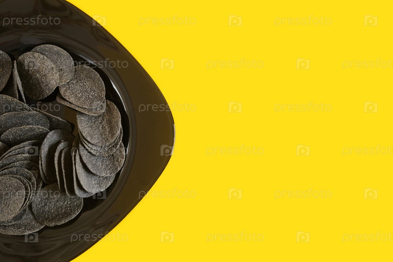 Черные картофельные чипсы на черной тарелке, желтый фон, пространство для копирования, вид сверху, чипсы из натуральных ингредиентов, тренд закусок