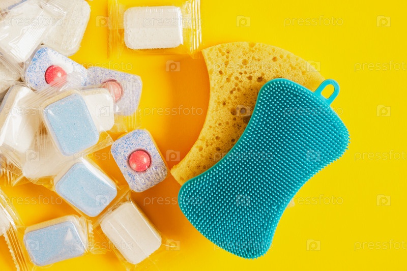 Таблетки для посудомоечной машины и две разные эко-губки на желтом фоне, средства для мытья посуды, мытье посуды вручную или использование посудомоечной машины