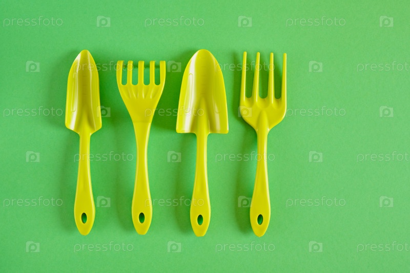 Садовые инструменты лопаты и грабли на зеленом фоне. Концепция посадки копировального пространства вид сверху