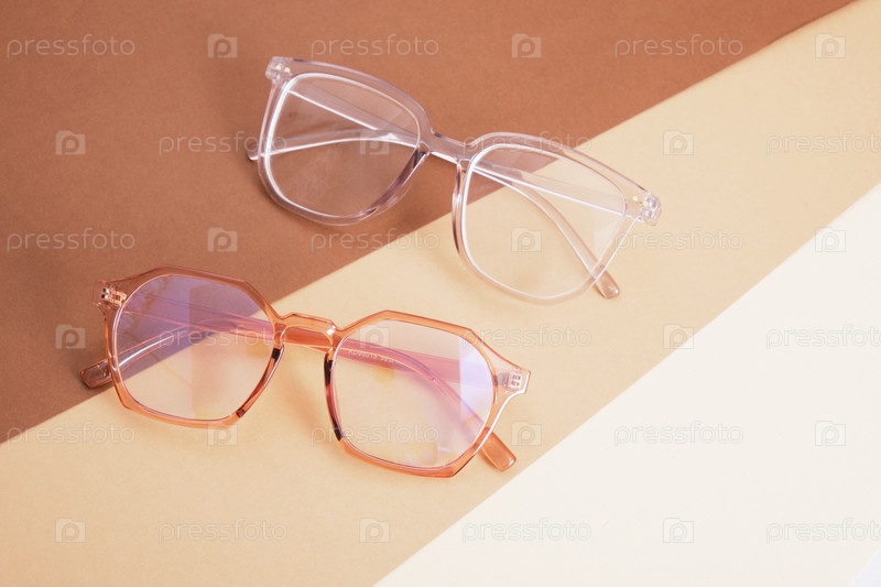 Несколько пар очков на геометрическом фоне разных оттенков коричневого