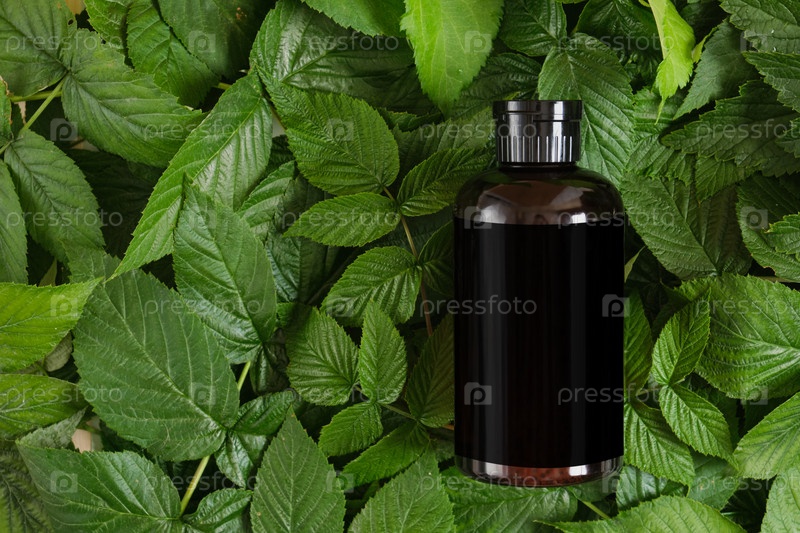 Косметическая бутылка из темно-коричневого пластика на зеленых листьях. концепция натуральной косметики и ухода за телом
