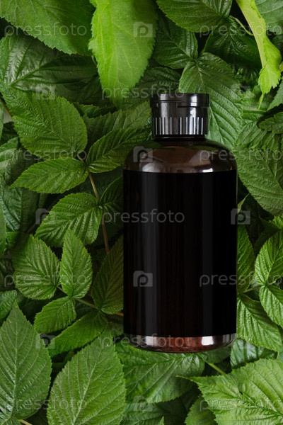 Косметическая бутылка из темно-коричневого пластика на зеленых листьях. концепция натуральной косметики и ухода за телом, пустая этикетка для макета брендинга