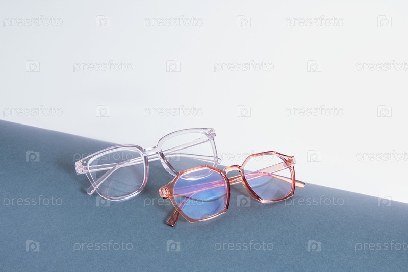 Несколько пар очков на темно-серой обернутой бумаге, трендовые модные очки для коррекции зрения на сером фоне