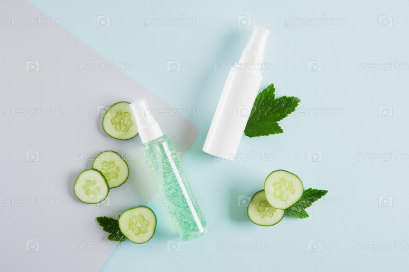 Смоделируйте пустую бутылку с косметическим гелем для лица с огурцом, лосьоном для ухода за зеленой кожей с огурцом