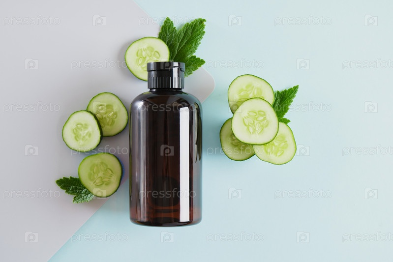 Макет пустой бутылки и ломтиков огурца, темно-коричневая пластиковая бутылка с косметическим продуктом по уходу за кожей с огурцом