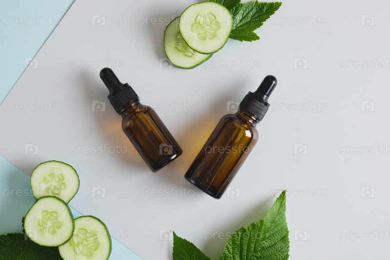 Смоделируйте пустую бутылку из янтарного стекла с пипетками и ломтиками огурца, темно-коричневую бутылку-капельницу с косметическим продуктом