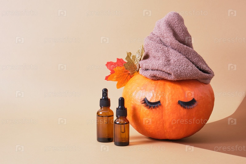Макет набора косметических контейнеров с пипетками из янтарного стекла и тыквы с полотенцем и накладными ресницами на бежевом фоне, натуральный уход за кожей в осенней концепции