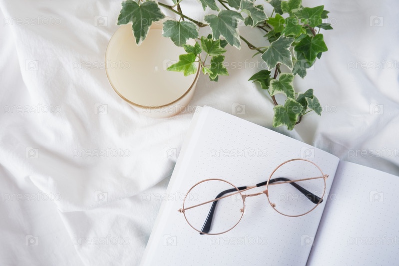 Очки, ароматическая свеча, цветок в горшке и открытый пустой блокнот на белой скомканной ткани