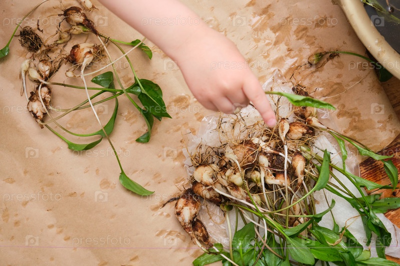 Процесс пересадки комнатного растения Дримиопсис, крупный план луковичного растения. ребенок сажает цветок