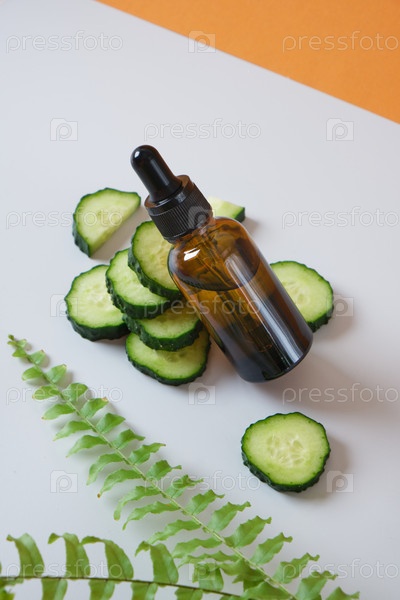 Листья папоротника, ломтики огурца и бутылка-капельница из коричневого стекла, сыворотка или косметическое масло в бутылке с капельницей