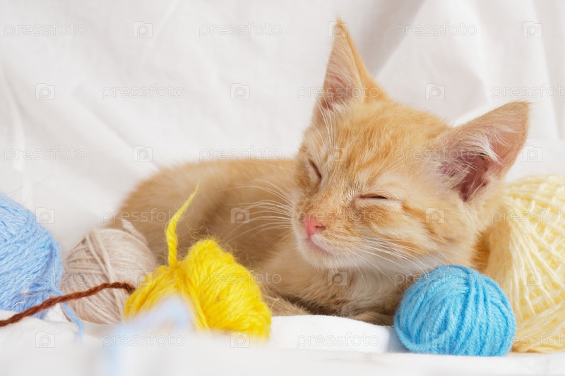 Милый рыжий кот и разноцветные клубки ниток на фоне белого постельного белья, котенок сладко спит после игры с нитками на кровати