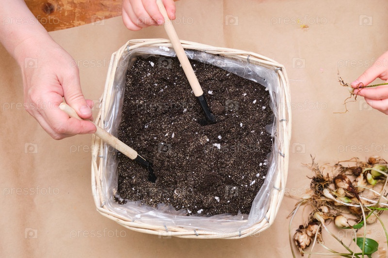 Процесс пересадки комнатного растения Дримиопсис, крупный план луковичного растения. пожилая женщина и ребенок сажают цветок