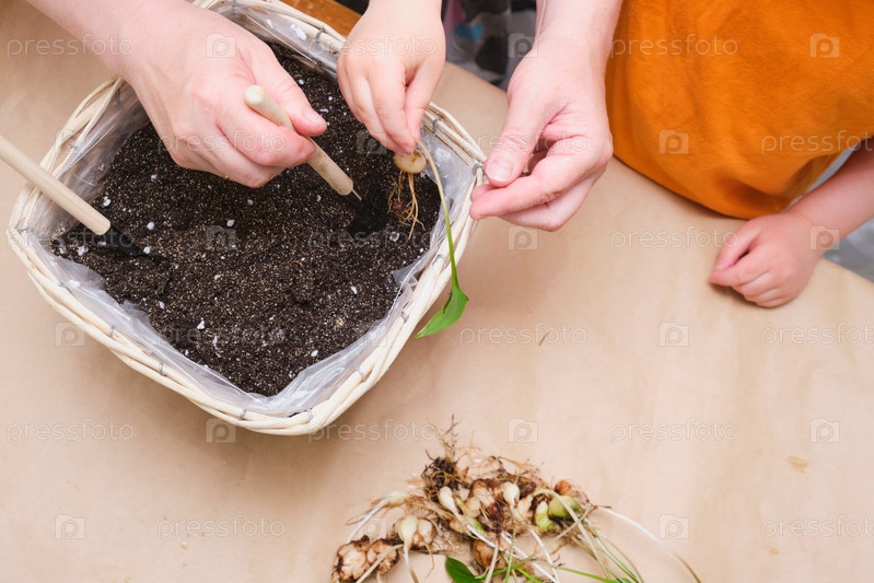 Процесс пересадки комнатного растения Дримиопсис, крупный план луковичного растения. пожилая женщина и ребенок сажают цветок