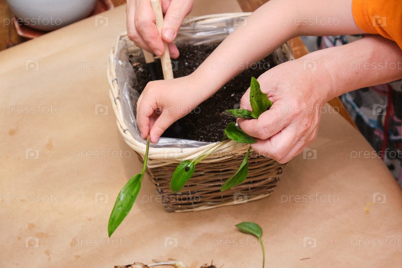Процесс пересадки комнатного растения Дримиопсис, крупный план луковичного растения. пожилая женщина и ребенок сажают цветок