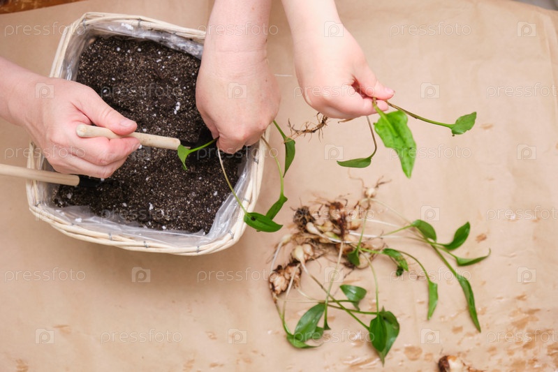 Процесс пересадки комнатного растения Дримиопсис, крупный план луковичного растения. пожилая женщина и ребенок сажают цветок