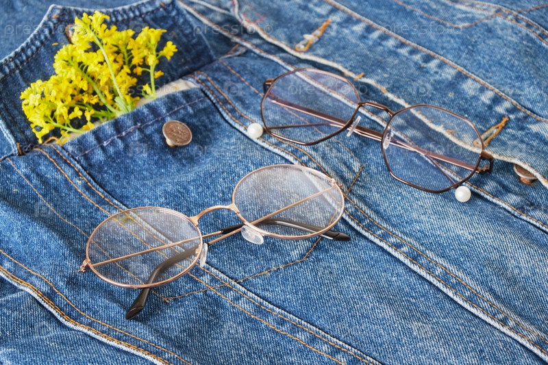 Очки с круглыми металлическими оправами на кармане синей джинсовой куртки, модные очки для глаз, стиль ретро