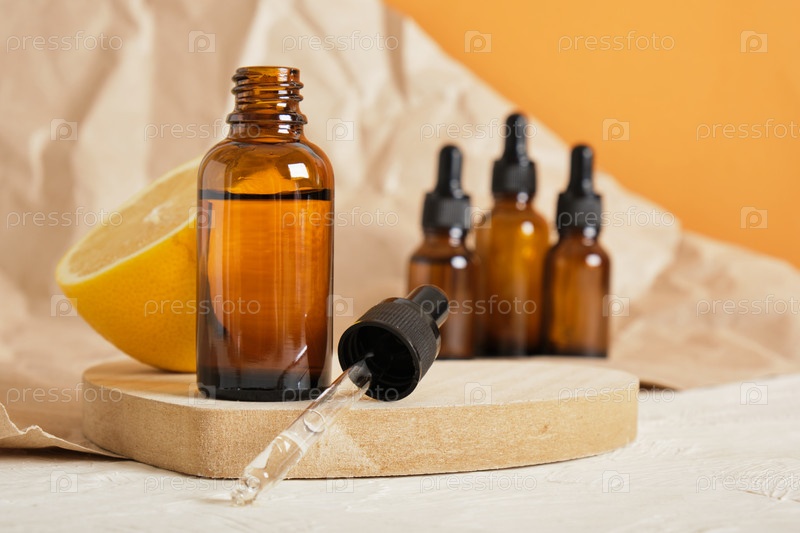 Лимонная и коричневая стеклянная бутылка с капельницей для сыворотки или косметического масла на деревянном подиуме в форме сердца,