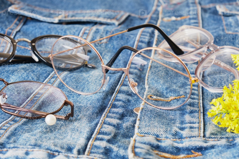 Очки на джинсовой куртке, старая куртка из синих джинсов и очки с несколькими глазами, модные оправы для очков