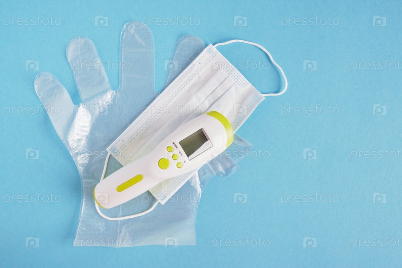 Поверхностный термометр с цифровым экраном, пластиковыми перчатками и маской на синем фоне