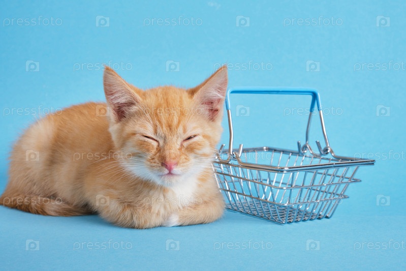 Котенок с корзиной для покупок на синем фоне. покупка животных. Зоомагазин